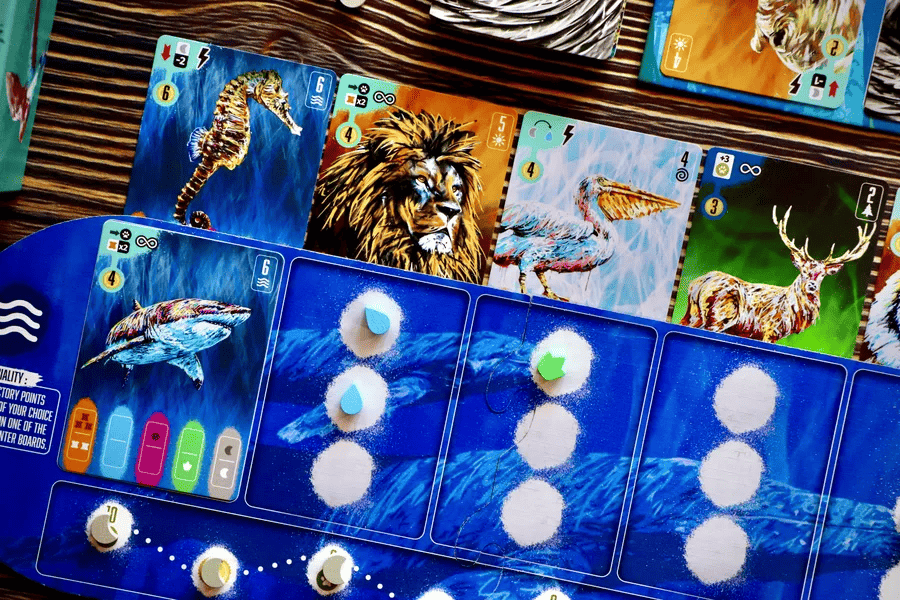 Coexist centers on open-drafting and resource-management mechanisms. Releasing animals into the wild earns you points and unlocks special skills, but you need to recognize your limits and avoid overestimating your team’s capabilities. The first player to release five species into the wild triggers the game end, then the player with the most points wins.