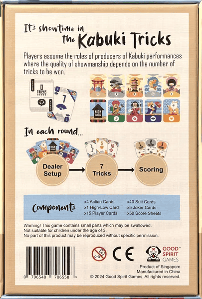 It’s showtime in Kabuki Tricks, with players becoming producers of Kabuki performances in which the quality of showmanship depends on the number of tricks to be won. The game is played over a number of rounds, with each player having a chance to play as the dealer. Each round plays out as follows: