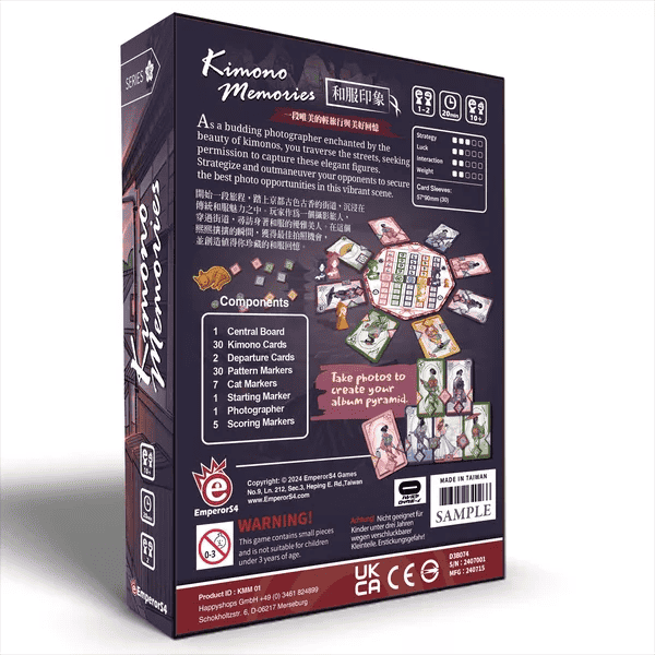 Kimono Memories is a two player competitive game where players draft cards from a rotating board to place in their own album pyramids. The goal is to collect the most kimono-clad beauties with matching patterns to gain the highest influence.
