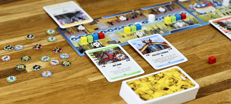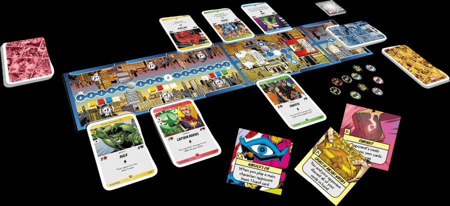 In MARVEL: Skirmish! In New York, each player takes one side of the battlefield in New York City, using their unique deck of either heroes or villains to control the landscape. Play your cards wisely, exploit the weaknesses of your opponent’s cards, gather valuable artifacts, and seize strategically important locations.