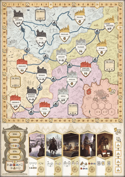 In this board game you will lead the boyar families competing for power and honor in the 16th-century Tsardom of Russia. Over four decades, you’ll collect income from estates and equip troops, trade with foreigners and fortify cities, seek privileges and carry out royal assignments. Use your influence on the tsar, bribe his minions, and perhaps it is your family that will succeed in taking the Russian throne in the next century.